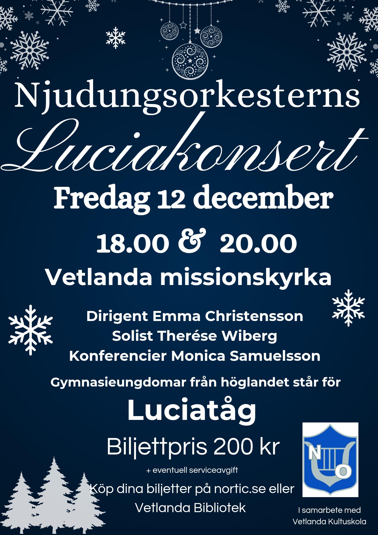 Vi i Njudungsorksetern välkomnar dig till vår luciakonsert. Det bjuds på julmusik av Njudungsorkestern och luciatåg med gymnasieungdomar från höglandet. Sångsolist är Therése Wiberg och konferencier är Monica Samuelsson. Observera att det är två olika tider med olika biljettsidor. Njudungsorkestern i samarbete med Vetlanda kulturskola.