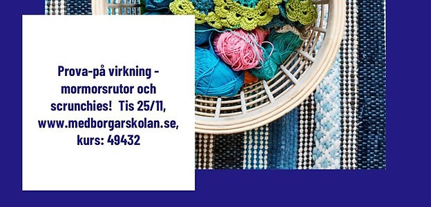 Under kurskvällen får du prova att virka en mormorsruta, grytlapp eller kanske vill du göra egna mjuka hårsnoddar (scrunchies)!