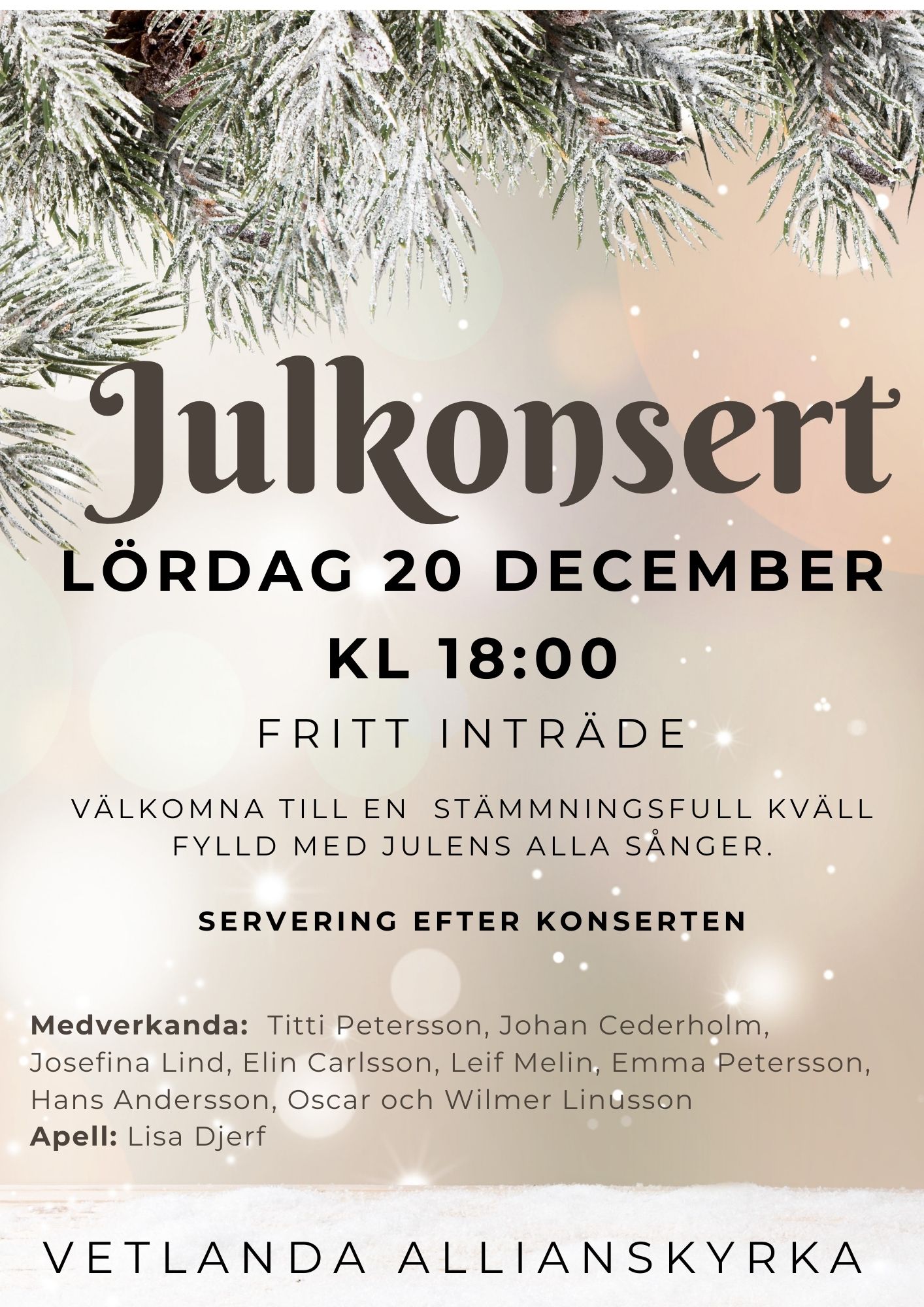 Lördag 20 december klockan 18 är det julkonsert i Vetlanda Allianskyrka.